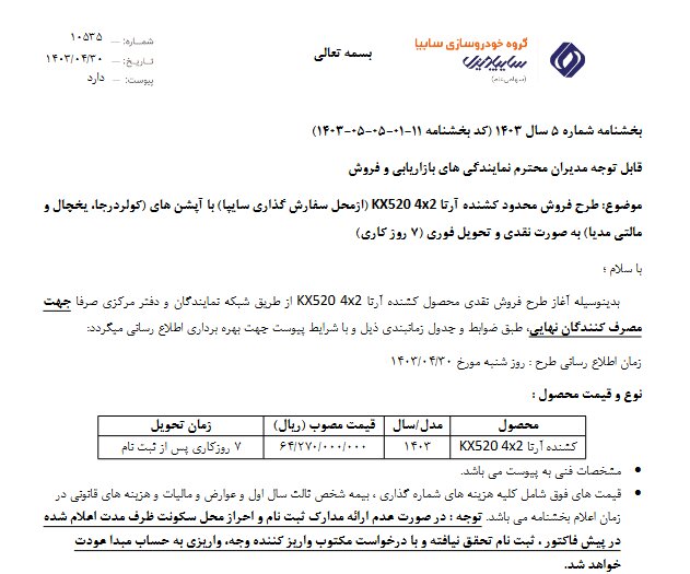 گروه خودروسازی سایپادیزل (به عنوان زیرمجموعه سایپا) در کنار این طرح فروش گروه سایپا، از هشت صبح فردا (دوشنبه یکم مرداد ماه)، طرح فروش فوری کشنده آرتا KX۵۲۰ ۴*۲ که به تعداد محدود نیز عرضه خواهد خواهد کرد و تا زمان تکمیل ظرفیت هم ادامه خواهد داشت.